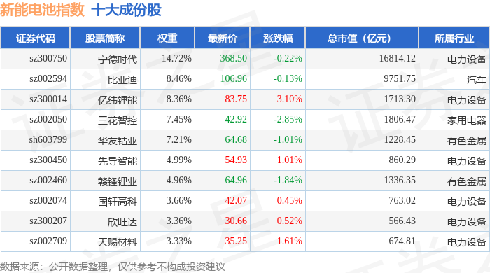 证券之星消息,10月16日,新能电池(980032)指数报收于15320.86点,跌0.1%,成交796.87亿元,换手率3.73%。当日该指数成份股中,上涨的有12家,特锐德以6.01%的涨幅领涨,下跌的有18家,厦门钨业以3.13%的跌幅领跌。