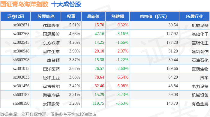 国证青岛海洋(980532)指数十大成份股详情如下:
