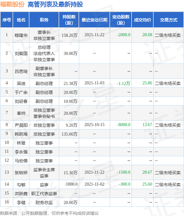 福鞍股份近半年内的董监高及核心技术人员增减持详情如下: