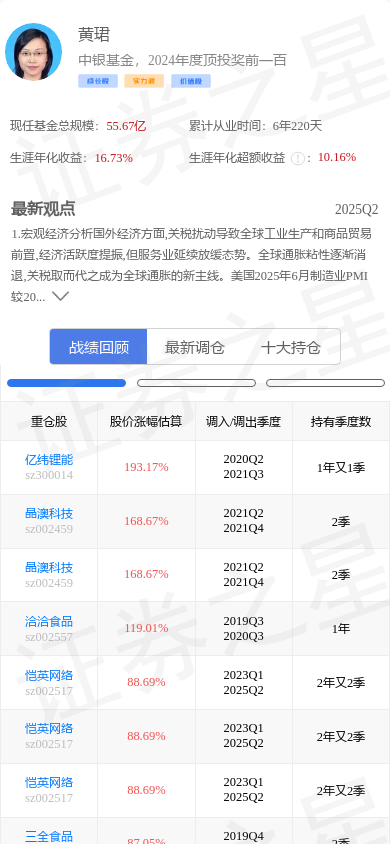 国睿科技(600562)是基金经理黄珺的重仓股。,其在整个职业生涯内年化收益高达16.73%。黄珺的大佬持仓 - 战绩回顾截图如下: