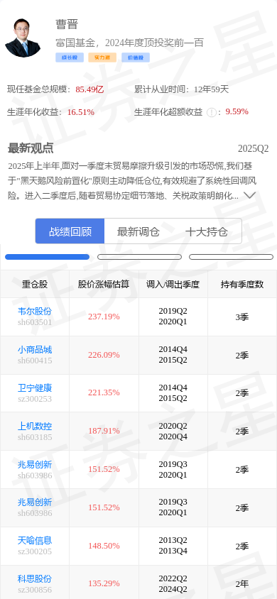 绿联科技(301606)是基金经理曹晋的重仓股。,其在整个职业生涯内年化收益高达16.51%。曹晋的大佬持仓 - 战绩回顾截图如下:
