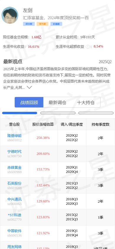 沃格光电(603773)是基金经理左剑的重仓股。,其在整个职业生涯内年化收益高达16.61%。左剑的大佬持仓 - 战绩回顾截图如下: