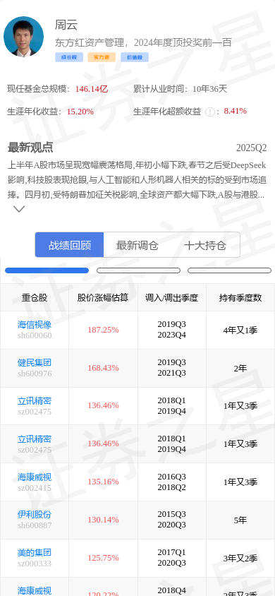 海泰新光(688677)是基金经理周云的重仓股。,其在整个职业生涯内年化收益高达15.2%。周云的大佬持仓 - 战绩回顾截图如下: