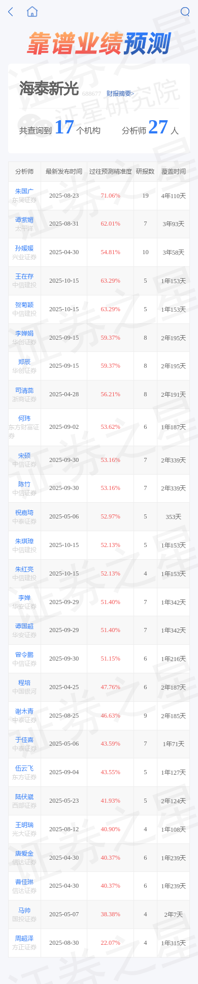 如果您对这家公司感兴趣,可以参考证星研究院统计的海泰新光的分析师业绩预测数据,其中根据东吴证券的分析师朱国广预测公司未来PE为22.0(更多特色估值数据尽在证星研究院,所有数据均来源公开资料,期且所有资料都存在一定时间滞后,所有相关数据均不可作为投资决策单一依据)。