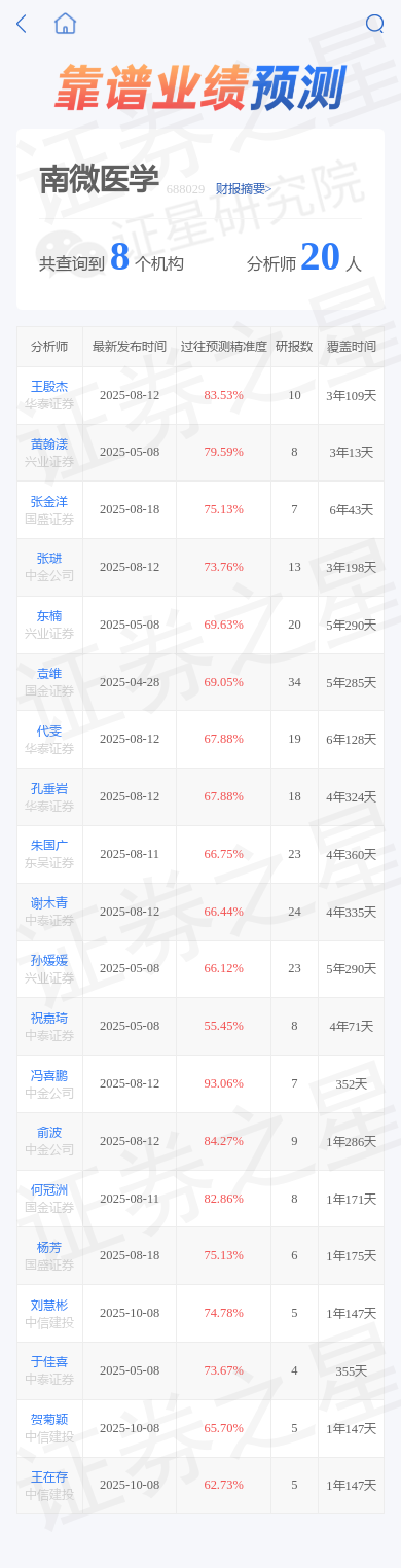 如果您对这家公司感兴趣,可以参考证星研究院统计的南微医学的分析师业绩预测数据,其中根据华泰证券的分析师王殷杰预测公司未来PE为18.0(更多特色估值数据尽在证星研究院,所有数据均来源公开资料,期且所有资料都存在一定时间滞后,所有相关数据均不可作为投资决策单一依据)。