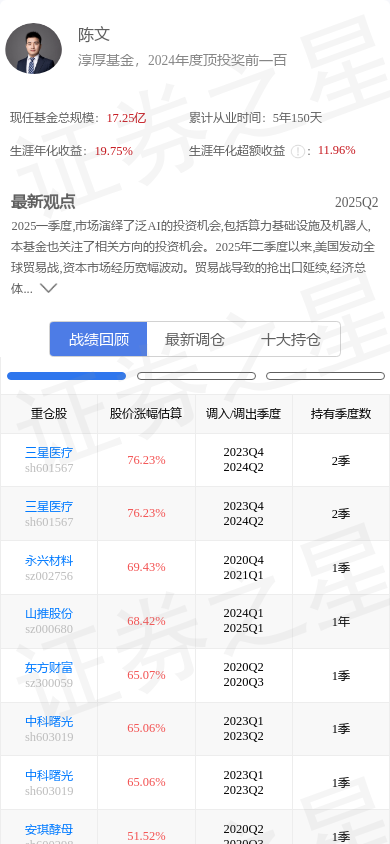远大医药(00512)是基金经理陈文的重仓股。,其在整个职业生涯内年化收益高达19.75%。陈文的大佬持仓 - 战绩回顾截图如下:
