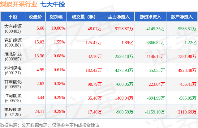 个股表现方面,煤炭开采行业当日领涨股为大有能源(600403),该股当日报收6.6,上涨10.0%,成交量48.07万,主力资金净流入9728.87万元。兖矿能源(600188)以上涨1.55%紧随其后,该股当日成交量125.47万,主力资金净流入1.89亿元。除此之外,淮北矿业(600985)、郑州煤电(600121)、甘肃能化(000552)均进入当日牛股之列。具体个股列表见下表: