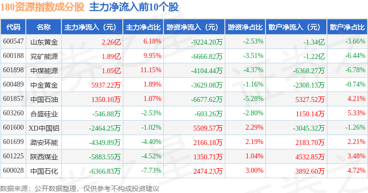 资金流向方面,180资源(000026)指数成份股当日主力资金净流出合计23.92亿元,游资资金净流入合计4641.97万元,散户资金净流入合计23.45亿元。成份股资金流向详情见下表: