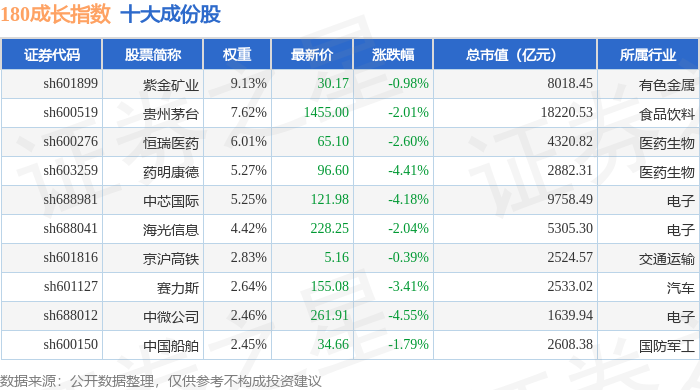 180成长(000028)指数十大成份股详情如下: