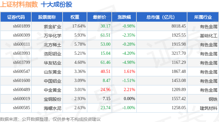 上证材料(000033)指数十大成份股详情如下: