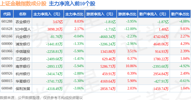资金流向方面,上证金融(000038)指数成份股当日主力资金净流出合计37.23亿元,游资资金净流入合计9.68亿元,散户资金净流入合计27.55亿元。成份股资金流向详情见下表: