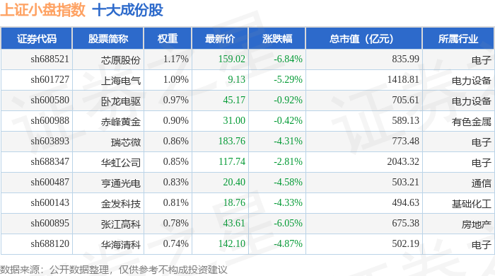 证券之星消息,10月17日,上证小盘(000045)指数报收于5529.14点,跌2.96%,成交2028.94亿元,换手率1.91%。当日该指数成份股中,上涨的有26家,白银有色以9.93%的涨幅领涨,下跌的有293家,金盘科技以12.32%的跌幅领跌。