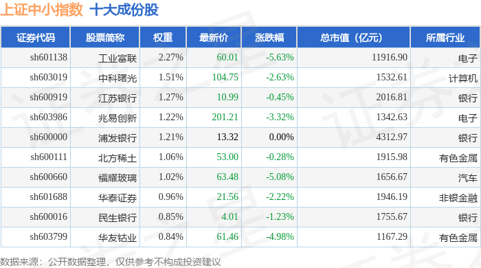 证券之星消息,10月17日,上证中小(000046)指数报收于5026.67点,跌2.52%,成交3601.41亿元,换手率1.4%。当日该指数成份股中,上涨的有41家,白银有色以9.93%的涨幅领涨,下跌的有402家,金盘科技以12.32%的跌幅领跌。