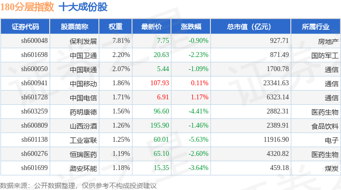 证券之星消息,10月17日,180分层(000093)指数报收于12141.55点,跌1.83%,成交3059.96亿元,换手率0.63%。当日该指数成份股中,上涨的有19家,中金黄金以2.21%的涨幅领涨,下跌的有155家,生益科技以10.0%的跌幅领跌。