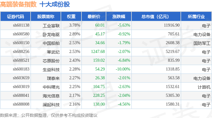 证券之星消息,10月17日,高端装备(000097)指数报收于10863.46点,跌4.14%,成交1488.18亿元,换手率1.76%。当日该指数成份股中,上涨的有1家,闻泰科技以4.28%的涨幅领涨,下跌的有58家,生益科技以10.0%的跌幅领跌。