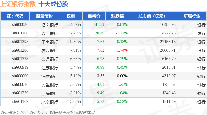 证券之星消息,10月17日,上证银行(000134)指数报收于1038.82点,跌0.32%,成交336.03亿元,换手率0.35%。当日该指数成份股中,上涨的有7家,农业银行以1.74%的涨幅领涨,下跌的有17家,兴业银行以1.27%的跌幅领跌。