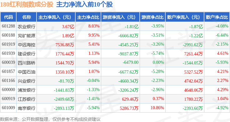 资金流向方面,180红利(000149)指数成份股当日主力资金净流出合计18.19亿元,游资资金净流入合计4.48亿元,散户资金净流入合计13.71亿元。成份股资金流向详情见下表: