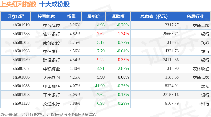 证券之星消息,10月17日,上央红利(000152)指数报收于2849.34点,跌0.53%,成交343.96亿元,换手率0.27%。当日该指数成份股中,上涨的有4家,农业银行以1.74%的涨幅领涨,下跌的有23家,中粮糖业以2.87%的跌幅领跌。