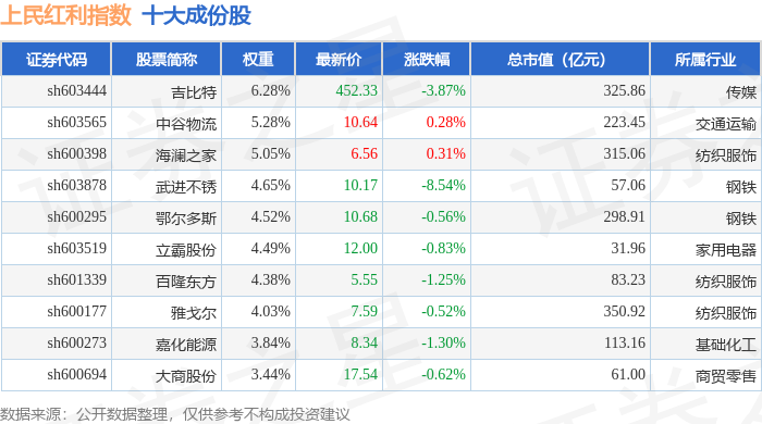 证券之星消息,10月17日,上民红利(000153)指数报收于3136.86点,跌1.22%,成交53.88亿元,换手率1.13%。当日该指数成份股中,上涨的有3家,新澳股份以1.19%的涨幅领涨,下跌的有26家,武进不锈以8.54%的跌幅领跌。