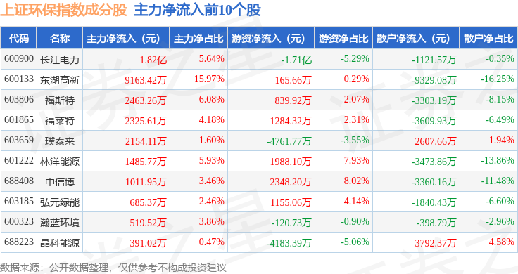资金流向方面,上证环保(000158)指数成份股当日主力资金净流出合计36.59亿元,游资资金净流入合计8.65亿元,散户资金净流入合计27.95亿元。成份股资金流向详情见下表:
