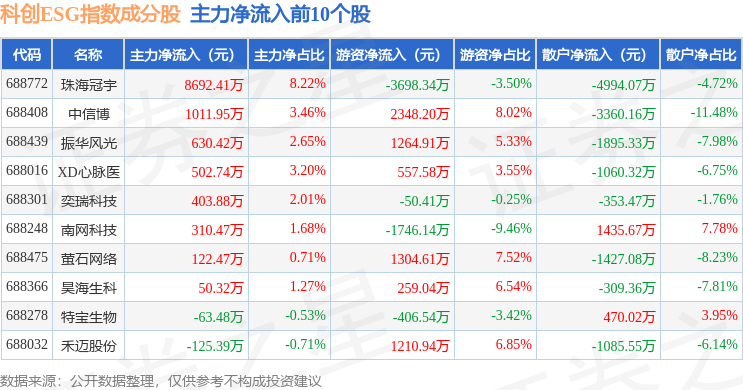 资金流向方面,科创ESG(000691)指数成份股当日主力资金净流出合计42.39亿元,游资资金净流入合计25.56亿元,散户资金净流入合计16.83亿元。成份股资金流向详情见下表:
