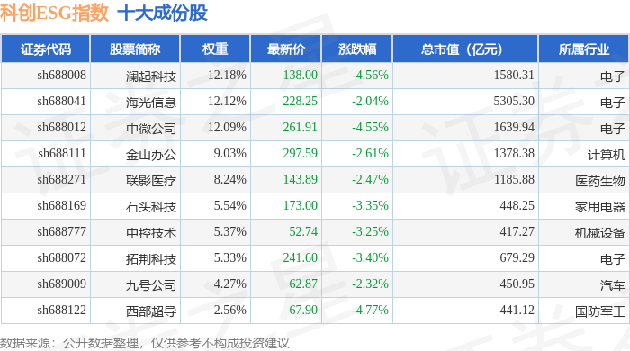 证券之星消息,10月17日,科创ESG(000691)指数报收于1434.86点,跌3.6%,成交449.75亿元,换手率1.44%。当日该指数成份股中,下跌的有50家,金盘科技以12.32%的跌幅领跌。
