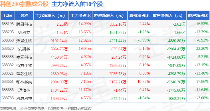 资金流向方面,科创200(000699)指数成份股当日主力资金净流出合计33.44亿元,游资资金净流入合计20.27亿元,散户资金净流入合计13.17亿元。成份股资金流向详情见下表: