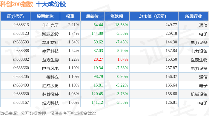 证券之星消息,10月17日,科创200(000699)指数报收于1192.81点,跌4.41%,成交509.71亿元,换手率2.76%。当日该指数成份股中,上涨的有9家,热景生物以2.8%的涨幅领涨,下跌的有190家,仕佳光子以18.58%的跌幅领跌。