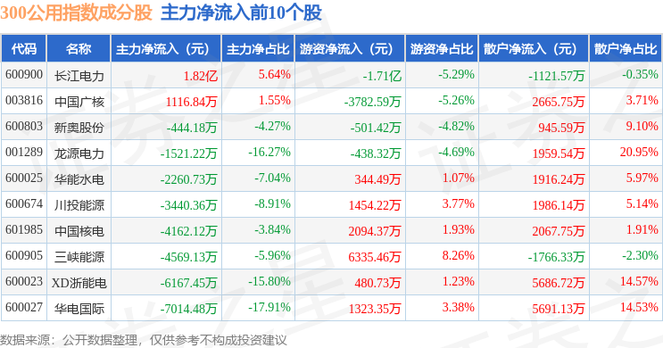 资金流向方面,300公用(000917)指数成份股当日主力资金净流出合计3.38亿元,游资资金净流出合计1981.27万元,散户资金净流入合计3.58亿元。成份股资金流向详情见下表: