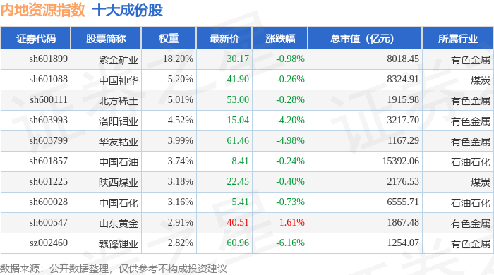 证券之星消息,10月17日,内地资源(000944)指数报收于4751.4点,跌1.56%,成交995.63亿元,换手率1.09%。当日该指数成份股中,上涨的有8家,白银有色以9.93%的涨幅领涨,下跌的有41家,赣锋锂业以6.16%的跌幅领跌。