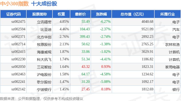 中小300(399008)指数十大成份股详情如下: