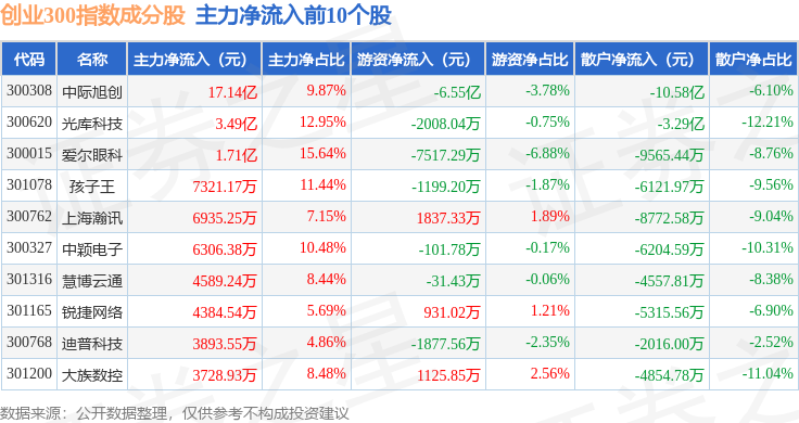 资金流向方面,创业300(399012)指数成份股当日主力资金净流出合计210.41亿元,游资资金净流入合计44.17亿元,散户资金净流入合计166.24亿元。成份股资金流向详情见下表: