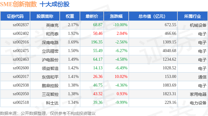 SME创新(399017)指数十大成份股详情如下: