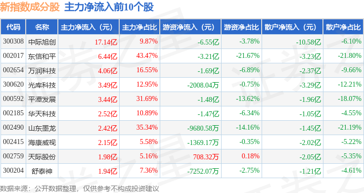 资金流向方面,新指数(399100)成份股当日主力资金净流出合计725.06亿元,游资资金净流入合计129.48亿元,散户资金净流入合计595.58亿元。成份股资金流向详情见下表: