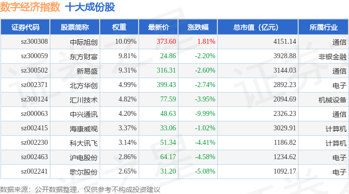 数字经济(399262)指数十大成份股详情如下: