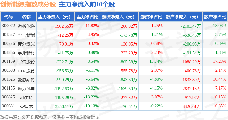 资金流向方面,创新能源(399266)指数成份股当日主力资金净流出合计89.11亿元,游资资金净流入合计17.79亿元,散户资金净流入合计71.32亿元。成份股资金流向详情见下表:
