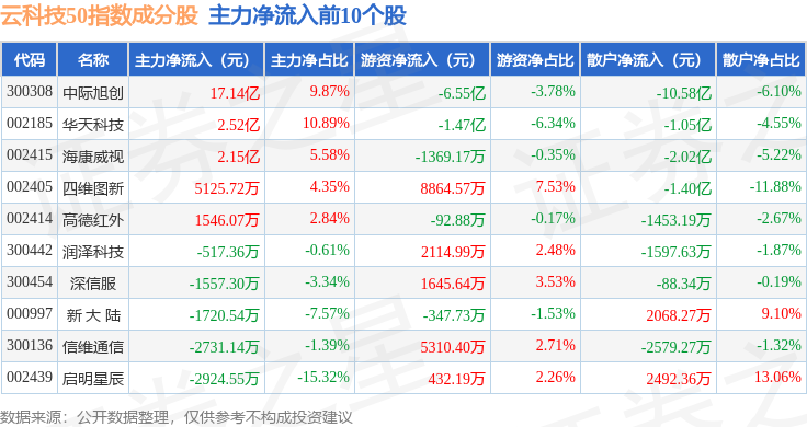资金流向方面,云科技50(399279)指数成份股当日主力资金净流出合计94.25亿元,游资资金净流入合计25.94亿元,散户资金净流入合计68.3亿元。成份股资金流向详情见下表: