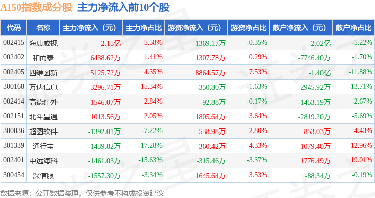 资金流向方面,AI50(399284)指数成份股当日主力资金净流出合计74.18亿元,游资资金净流入合计25.85亿元,散户资金净流入合计48.33亿元。成份股资金流向详情见下表: