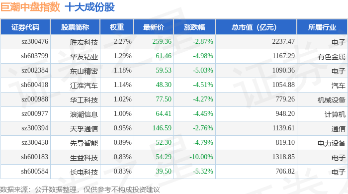 证券之星消息,10月17日,巨潮中盘(399315)指数报收于4488.2点,跌3.02%,成交2724.59亿元,换手率1.63%。当日该指数成份股中,上涨的有31家,华天科技以10.02%的涨幅领涨,下跌的有267家,生益科技以10.0%的跌幅领跌。