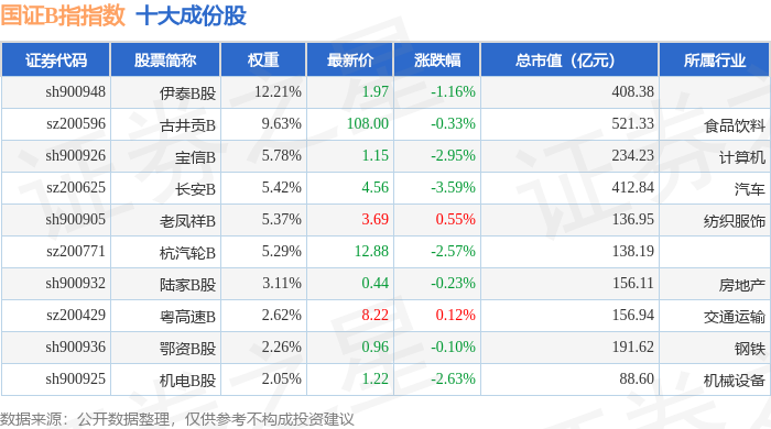 证券之星消息,10月17日,国证B指(399318)指数报收于5324.05点,跌1.34%,成交2.72亿元,换手率0.25%。当日该指数成份股中,上涨的有7家,方大B以1.25%的涨幅领涨,下跌的有68家,宁通信B以7.42%的跌幅领跌。