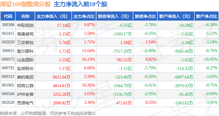 资金流向方面,深证100(399330)指数成份股当日主力资金净流出合计213.49亿元,游资资金净流入合计69.87亿元,散户资金净流入合计143.62亿元。成份股资金流向详情见下表:
