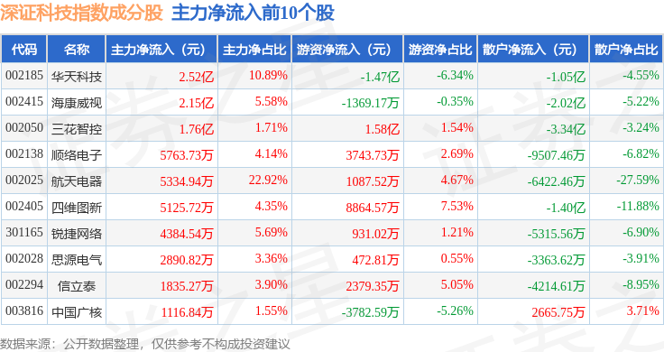 资金流向方面,深证科技(399339)指数成份股当日主力资金净流出合计234.36亿元,游资资金净流入合计64.56亿元,散户资金净流入合计169.8亿元。成份股资金流向详情见下表: