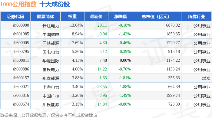 1000公用(399390)指数十大成份股详情如下: