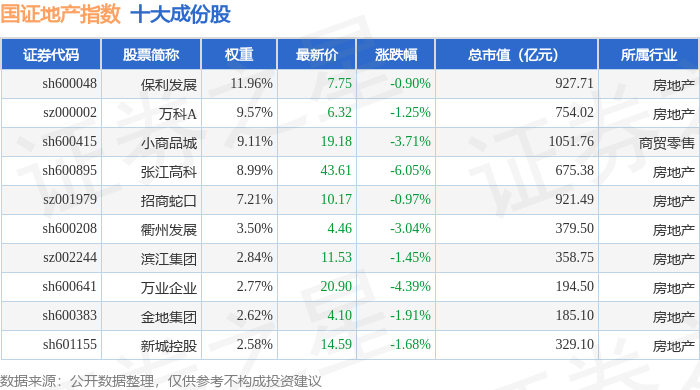国证地产(399393)指数十大成份股详情如下: