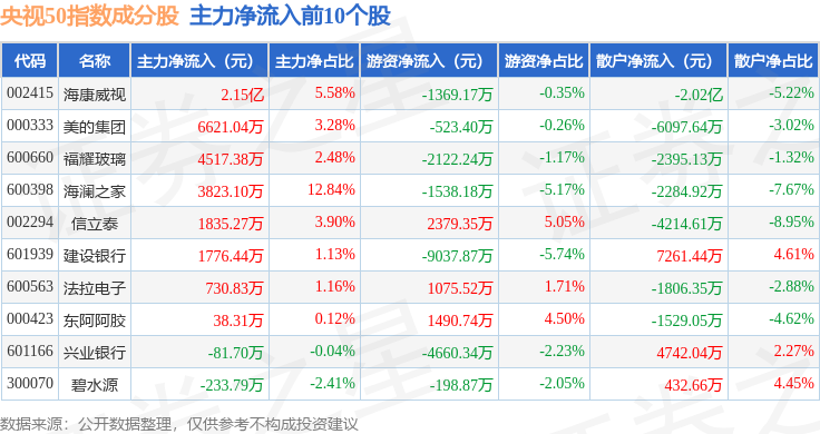 资金流向方面,央视50(399550)指数成份股当日主力资金净流出合计46.19亿元,游资资金净流入合计16.87亿元,散户资金净流入合计29.31亿元。成份股资金流向详情见下表: