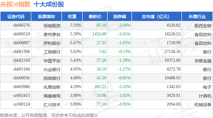 证券之星消息,10月17日,央视50(399550)指数报收于7871.36点,跌1.9%,成交702.94亿元,换手率0.42%。当日该指数成份股中,上涨的有4家,信立泰以0.51%的涨幅领涨,下跌的有46家,信维通信以6.45%的跌幅领跌。