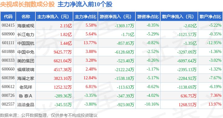 资金流向方面,央视成长(399552)指数成份股当日主力资金净流出合计34.85亿元,游资资金净流入合计10.86亿元,散户资金净流入合计23.99亿元。成份股资金流向详情见下表: