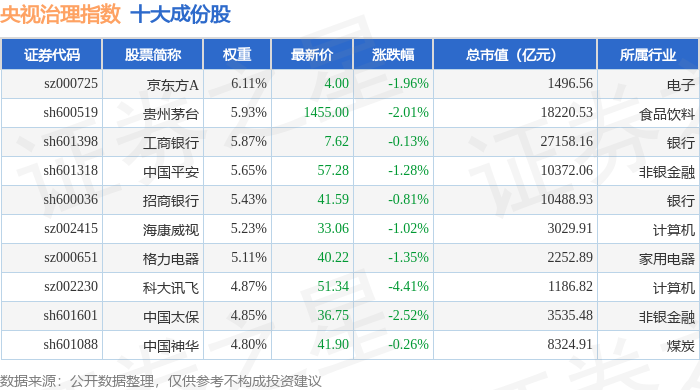 央视治理(399554)指数十大成份股详情如下:
