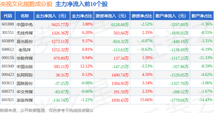 资金流向方面,央视文化(399557)指数成份股当日主力资金净流出合计45.16亿元,游资资金净流入合计9.14亿元,散户资金净流入合计36.02亿元。成份股资金流向详情见下表: