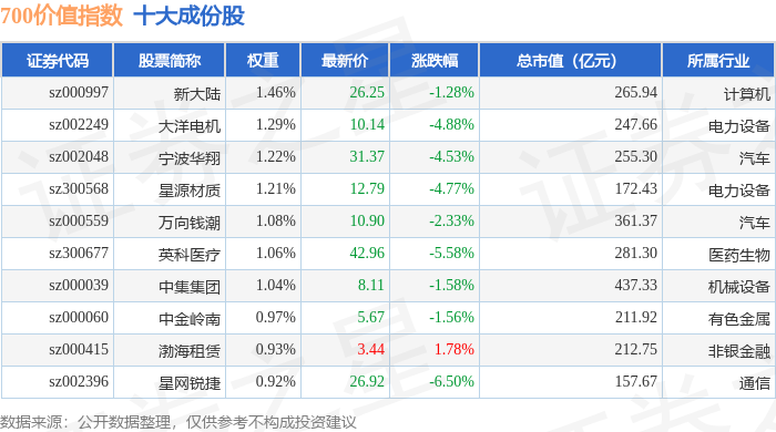 证券之星消息,10月17日,700价值(399629)指数报收于2808.92点,跌2.16%,成交585.08亿元,换手率2.18%。当日该指数成份股中,上涨的有22家,华邦健康以10.11%的涨幅领涨,下跌的有210家,华明装备以10.0%的跌幅领跌。